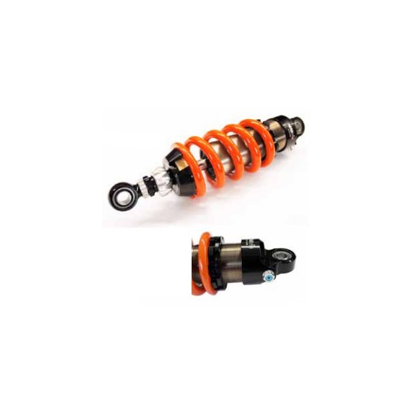 Monoamortisseur de type hydraulique, avec réservoir d'expansion intégré pressurisé à l'azote (gaz Nitrogène). Les éléments, fixes ou mobiles, sont usinés dans la masse d'aluminium léger Ergal 7075 et subissent un traitement de surface anodique dur.